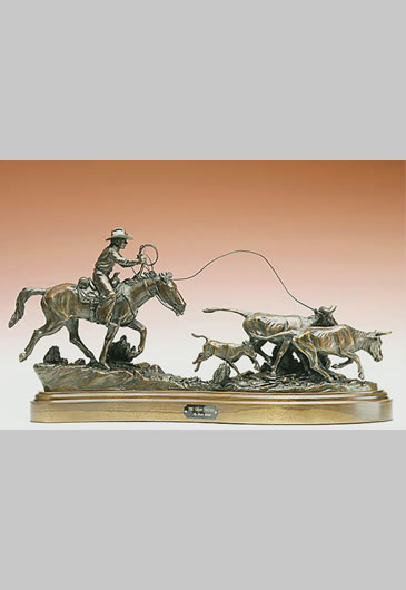 This sculpture is based on real life experiences of trying to catch the neighbor's cattle that ran out of pasture at home and jumped the border fences to get on the ranch I managed looking for greener pastures, so to speak.