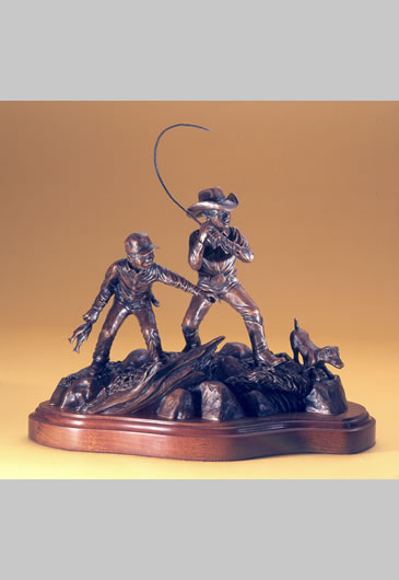 Most of the ranch kids I have known spend a good deal of time helping out around the ranch with chores, before catching a bus for the long ride into town to go to school. This sculpture is a tribute to those moments when they could find some time to just have fun fishing and playing outdoors. It makes me sad to see young people today spend so much time in front of a computer or watching television instead of getting out and relying on their own imaginations for their entertainment and exercise.