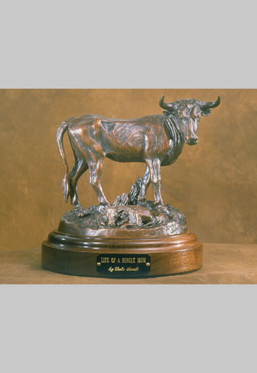 A Corriente cow keeps a close eye on her newborn calf in this bronze. The title sums up the parental arrangement in the bovine world. Once the bull has done his job, the rest of the work and care for the calf is the mama's lot in life.